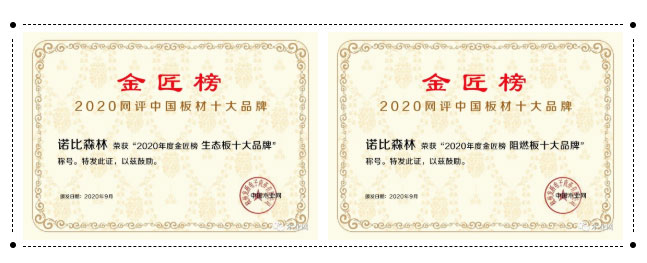 時(shí)間步入金秋九月,備受關(guān)注由中國木業(yè)網(wǎng)主辦的2020中國板材金匠榜網(wǎng)絡(luò)評選落下帷幕。在近千家品牌中,偉勝集團(tuán)旗下主打品牌諾比森林實(shí)力“亮劍”,一舉斬獲四項(xiàng)行業(yè)重量級大獎(jiǎng)——“匠心板材十大品牌”、“生態(tài)板十大品牌”、“行業(yè)影響力板材十大品牌”、“阻燃板十大品牌“,為高質(zhì)量的發(fā)展篇章增添了濃墨重彩的一筆。